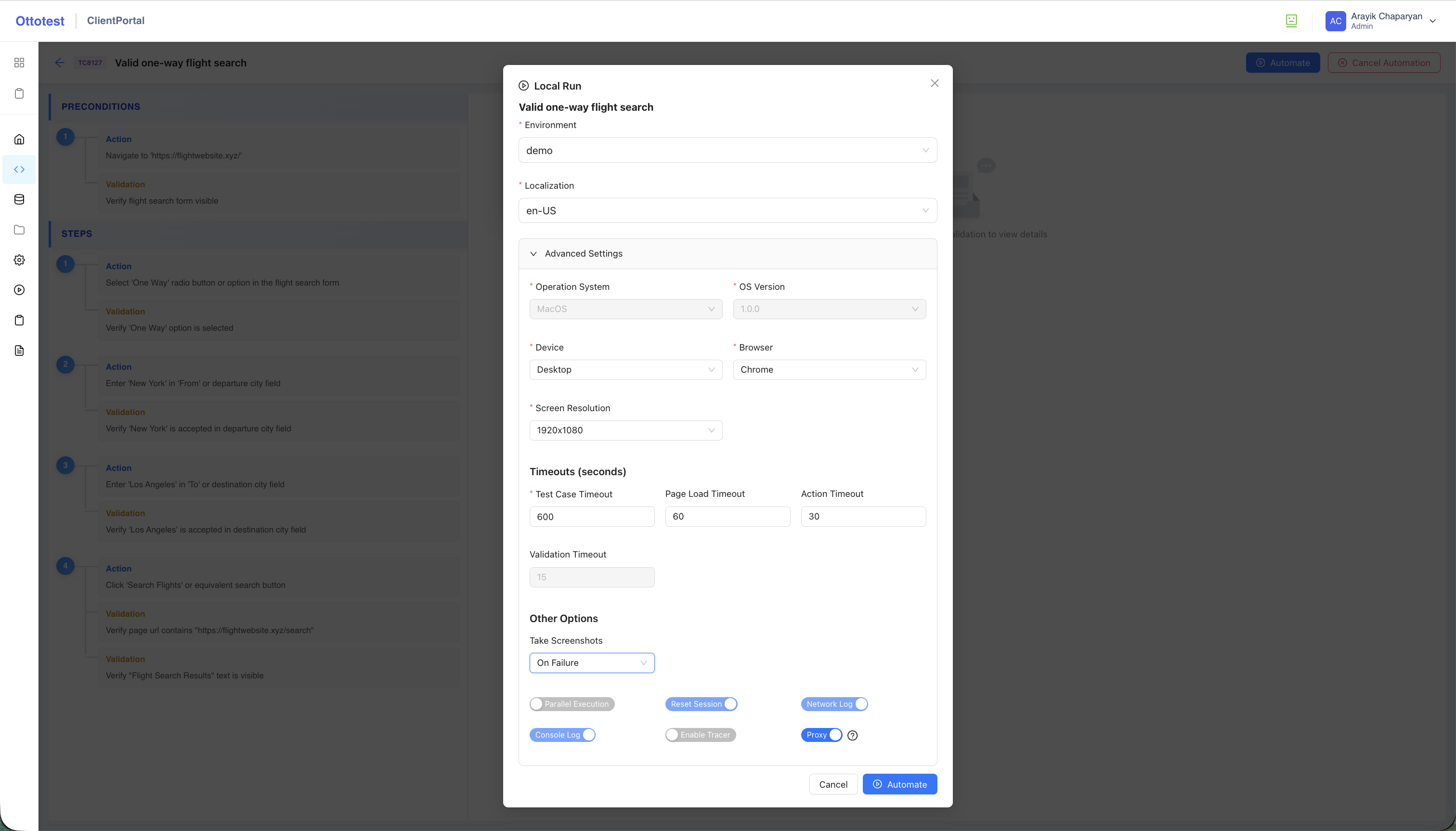 Note: The Proxy toggle option is available only for local runs. It allows test automation execution to use the same IP as in the cloud when necessary. By default, it is switched ON.