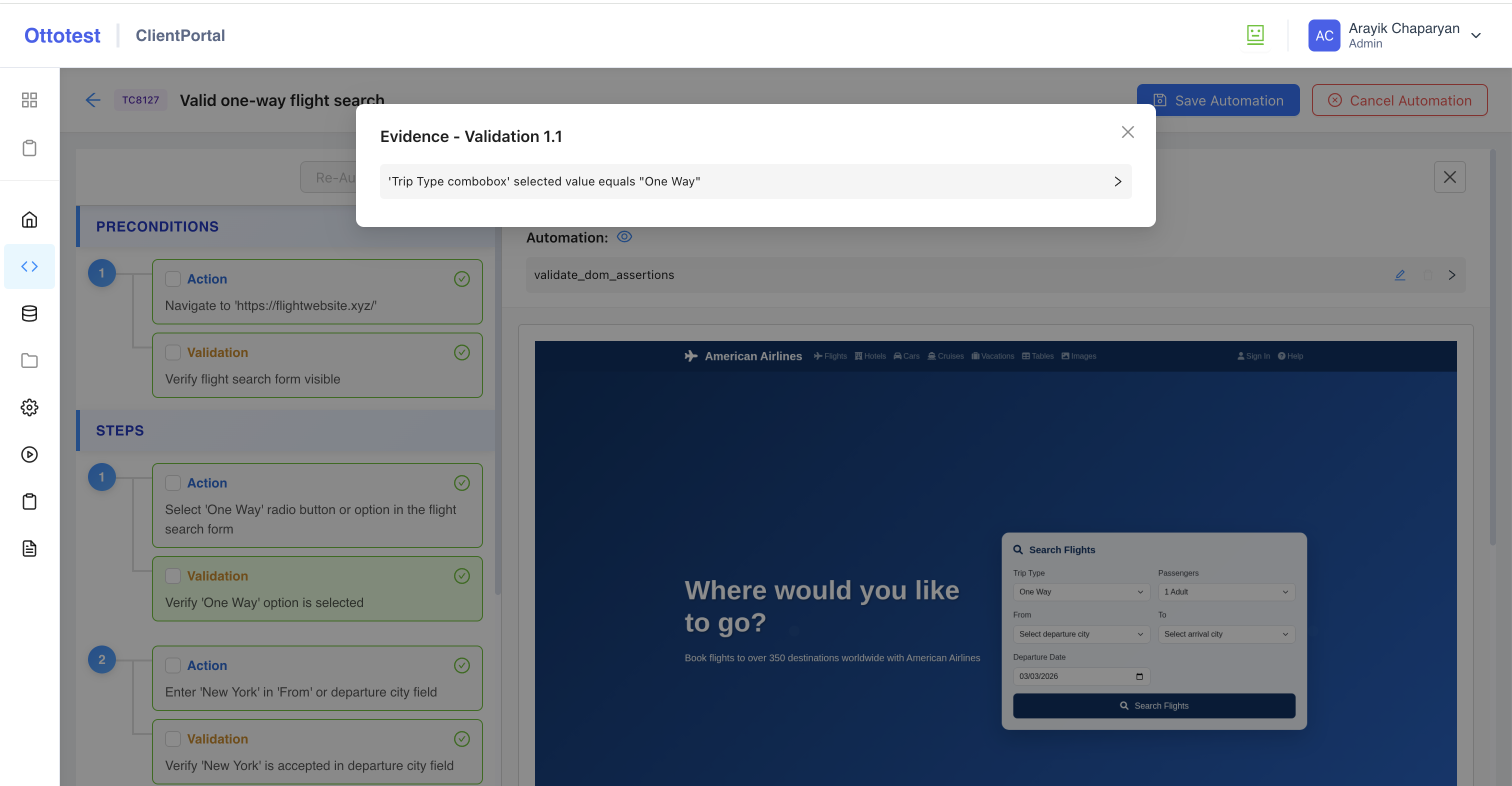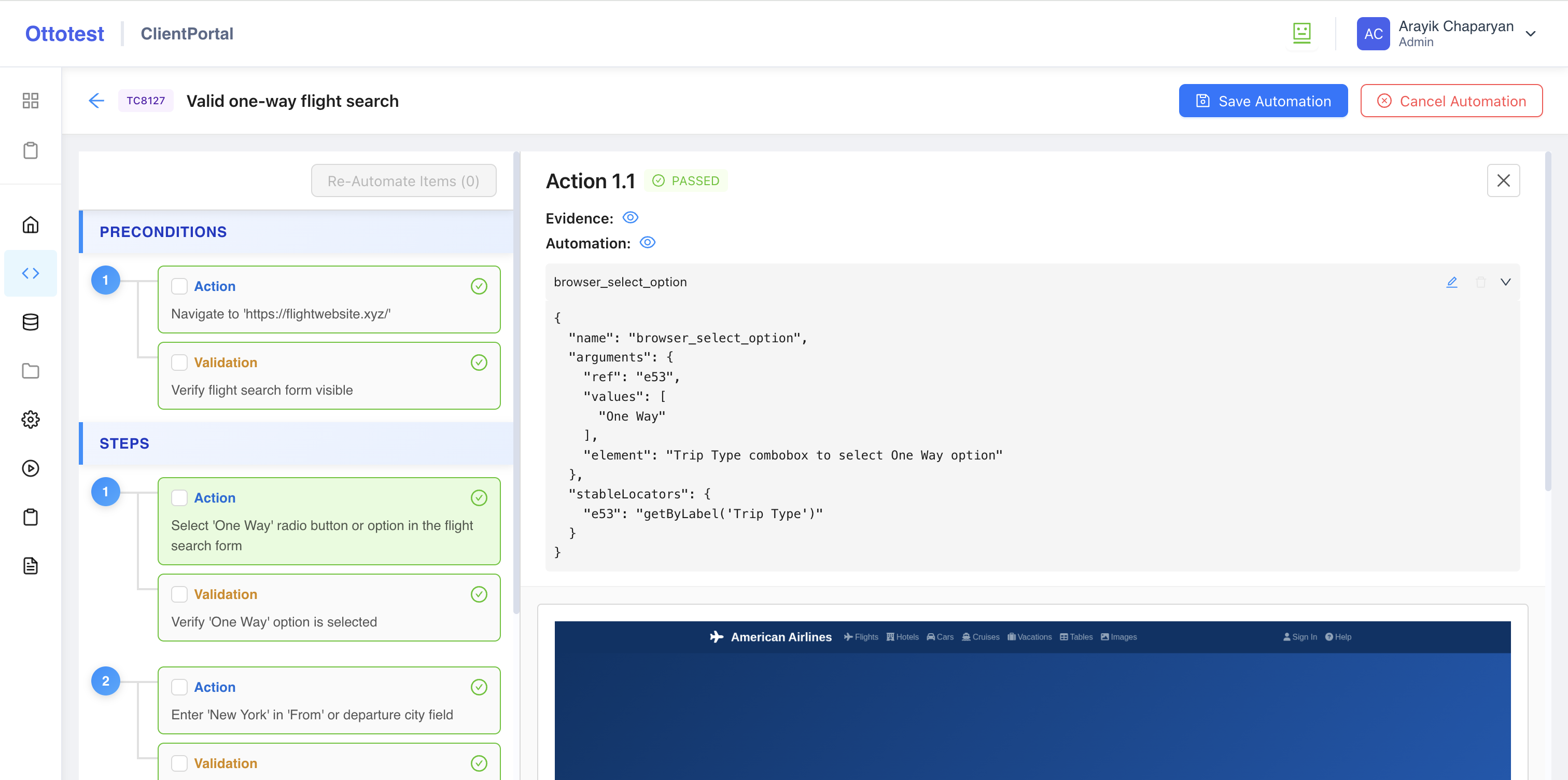Click any action or validation on the left panel to see its generated result. On the right panel you will see automation tool name and cicking the automation tool expands a detailed view.